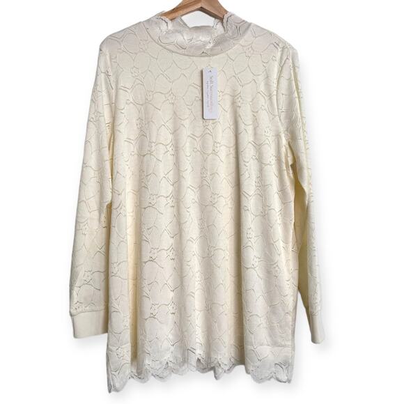 NWT Soft Surroundings Cream Lace Mock Neck Sheer Sleeve Tunic Blouse Women's L