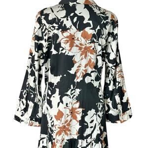 The Moonglow floral tiered midi shirt dress features a cotton blend fabric with a hint of stretch. It has 3/4 sleeves, a button-up front, and a tiered midi length skirt. The design includes a V-neck collar and is made of stretch poplin cotton blend.