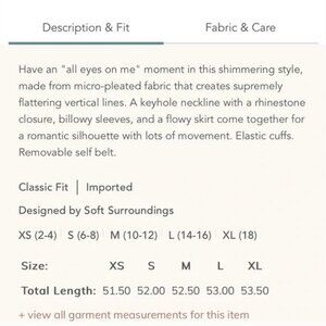 Have an "all eyes on me" moment in this shimmering style, made from micro-pleated fabric that creates supremely flattering vertical lines. A keyhole neckline with a rhinestone closure, billowy sleeves, and a flowy skirt come together for a romantic silhouette with lots of movement. Elastic cuffs. Removable self belt.