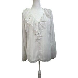 Embrace versatile style with the Soft Surroundings Xenia Ruffle Top, a chic addition to any wardrobe. Sized medium for a regular fit, this white and gold metallic striped tunic blouse features a flattering V-neck and elegant long puff sleeves. The woven polyester fabric offers a lightweight and sheer feel, perfect for layering or stand-alone wear.