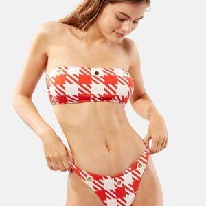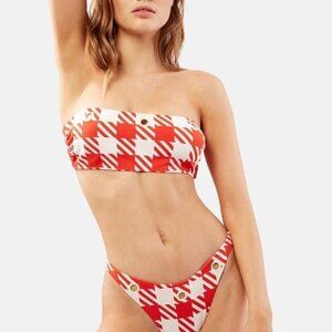 Gorgeous gingham goes modern with this Solid & Striped bikini top, courtesy of a pair of unexpected grommets and a magnified pattern.