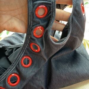 Design details: eyelet detailing, strappy back