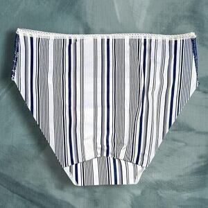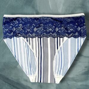 Features navy lace waistband and ivory-blue striped body. Lightweight stretch fit that moves smoothly under clothes without lines or bunching.