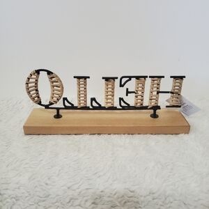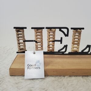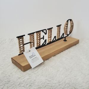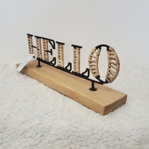 NWT "Hello" Table Decor Sentiment. Handcrafted, horizontal design, pine wood, light black steel, felt bottom & rattan wrapped around steel. Approximately measures 4" x 2.5" x 10.5". Sonoma Goods for Life. Brand new with tags!