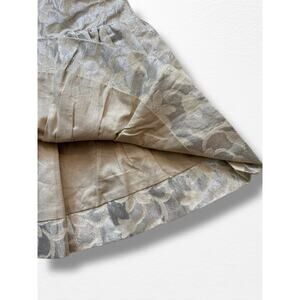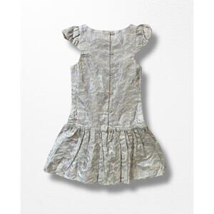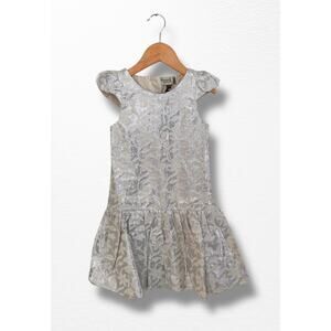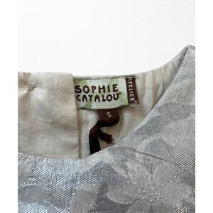 Silver/white party dress from boutique brand Sophie Catalou. Features cap sleeves, floral brocade, cotton lining, and buttons up the back. New with flaw: small faint mark on front (see last pic). I have not treated it since it is faint and difficult to notice.