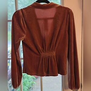Brand new with tags! Elegant Sophie Rue blazer in Leather Red — a deep rust-red velvet look that’s soft, structured, and flattering. Features a notched lapel, button-front closure, and gathered waist for a feminine tailored fit. Fully lined and perfect for fall layering, workwear, or holiday outfits.