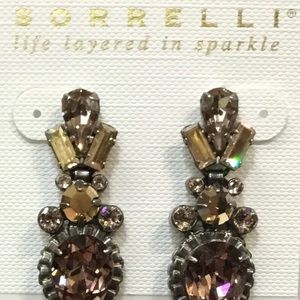 A large central pear crystal outlined with curb chain dangles from a cluster of round crystals. Topped with a ray created by two baguette stones on either side of a smaller pear shaped crystal, these exotic baubles will stun and amaze!