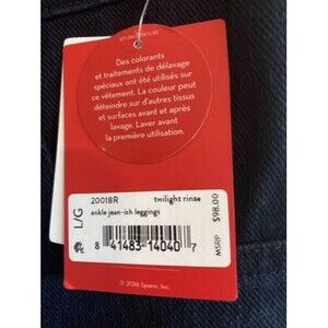 NWT Spanx Jean-ish Ankle Leggings Size Large Color Twilight Rinse 20018R. Jean-ish® Leggings feature a soft-knit fabric that feels like leggings and looks like your favorite jeans. With an interior shaping panel, this flattering style keeps you smooth and ultra-comfortable.Style No. 20018RDetailsThe Slim is Built In Gut Check shaping technology tames your tummyFaux-front pockets and functional back pockets create classic jean lookCare InstructionsBody: 69% Cotton, 26% Polyester, 5% Elastane. Lining: 57% Elastane, 43% Nylon.Wash Before Wearing. Machine Wash Cold, Gentle Cycle. With Like Colors. Inside Out. Only Non-Chlorine Bleach When Needed. Tumble Dry Low. Low Iron If Needed.Size & FitHits at natural waist for great coverage and no muffin topInseams: Regular - 27.5, Petite - 24.5", Tall - 29.5"If you are 58 or taller try our Tall inseam