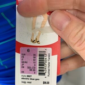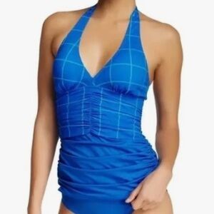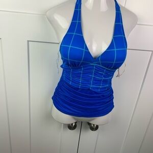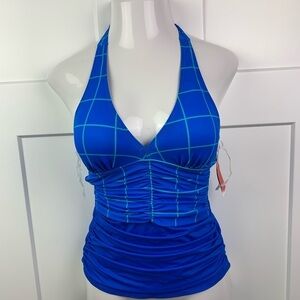NWT Spanx Ruched Halter Tankini Top Size 6 Electric Blue Geo Bathing Suit Swim