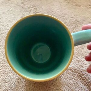 Home Drink Wine And Hang With My Dog Tall Ceramic Coffee Mug that features debossed black text graphics on both sides. This beautiful tall glossy white mug also features aqua green handle and inside coloring, and a tan rim accent.
