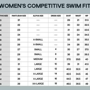 Review Competitive Fit size chart before purchase; Swimmers wishing to achieve a looser fit are encouraged to choose a larger size.
