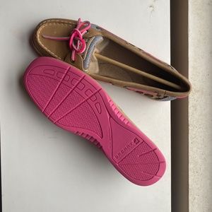 Brand new Sperry women’s boat shoes with animal/cheetah print side panels and pops of hot pink.