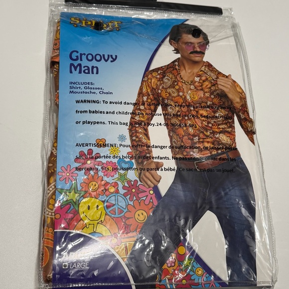 NWT Spirit Groovy Man Halloween Costume - includes size Large men’s shirt, glasses, mustache & chain. Never opened or worn. Perfect for retro disco event, Halloween party or just to be fun!