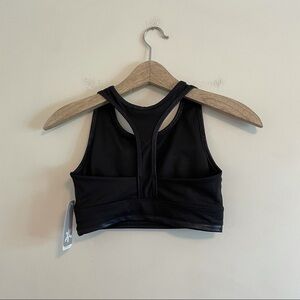 Features: Solid black with reflective trim, medium support, scoop neck sports bra.