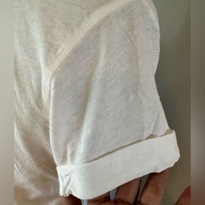 This is a classic lightweight tee with a scooped hemline and rolled short sleeves. It is crisp white and falls below the hips.