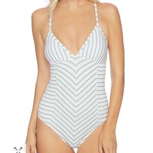 Striped one piece swimsuit designed with multi-directional patterns for a slimming silhouette. Features a V-neckline and cross back ties. Stripe print adds a playful summertime feel to this V-neck one-piece swimsuit with a chic lace-up back.