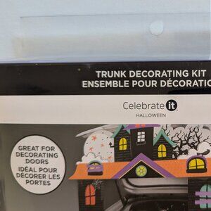 NWT awesome, creepy haunted house Halloween trunk decorating kit, Michaels Celebrate It brand. This new in packaging set of scary Samhain decorations features a black haunted house with boarded windows, a ghost, bat, spiderweb, craggy branches, clouds and a white moon with stars. Works great for 'trunk or treats' out of a car trunk, can also be used for door decor, walls, or an entry to your haunted house :) Packaging measures 24" in length, adhesive squares included. An eerie Halloween decoration set for trick or treats, and ghoulish partying!