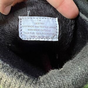 8" tall. Faux Fur, Super soft on the inside. Man Made and textile Upper.