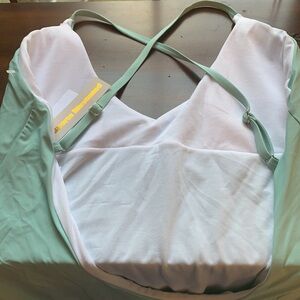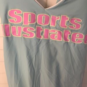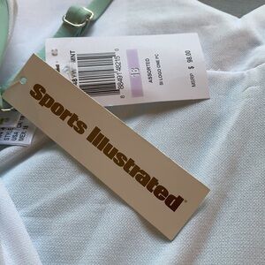 NWT $98 Sports Illustrated Mint Cross Back One Piece Swimsuit. Lightly padded with removable pads. Adjustable straps. Buttery soft material with nice stretch. Mint/light blue color with pink lettering. Coverage is cheeky. Cute for Halloween! Note: Last picture is same suit in rainbow color.