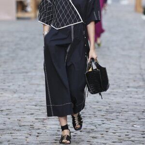 A symphony of structure and softness, the Spring 2022 Tory Burch Diamond Topstitch Sailor Dress in Black is a shadow-draped sonnet of the sea—where maritime heritage meets the hush of metropolitan midnight. Sculpted in a silhouette both commanding and lyrical, its diamond topstitching sketches secret constellations across the body, echoing the geometry of starlight caught in rigging. A collar nods to nautical romance, while the fluid lines whisper of tides and whispered rebellions. It is a dress for the woman who charts her own compass—elegant, enigmatic, and endlessly in motion.