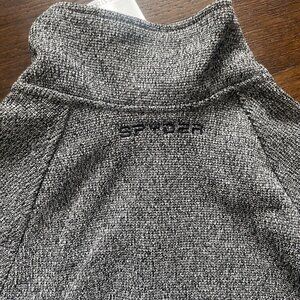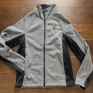 Men's Spyder Gray & Black Full Zip Core Sweater has a Spyder Logo & Name on the left chest area of the jacket. Fleece lined inside.