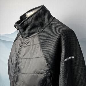 This lightweight track jacket by Spyder completes any athletic or athleisure outfit. Stay active and cozy in this hybrid jacket constructed with convenient zip pockets, quilted detailing down the front, thumb holes, and an allover black design. Whether skiing on a warm day or hitting the gym, you'll stay warm and stylish all day long.