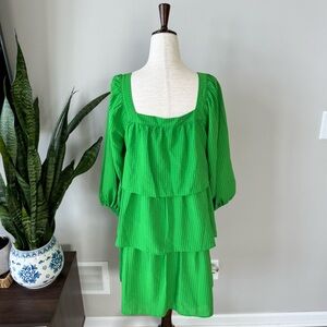 NWT! Square Neck Checkered Tier Layer Bubble Sleeve Dress - Color: Online Lime