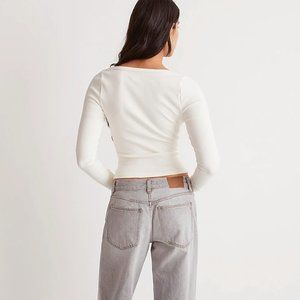 Cropped with a wider square neckline, this long-sleeved tee pairs perfectly with high-waisted jeans or shorts. Crafted of their Sleekhold, it's flattering on the body with a super touchable ribbed texture that holds you in (and feels nice against the skin).
