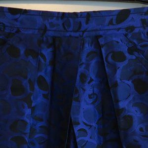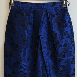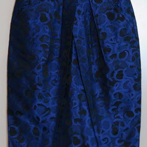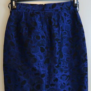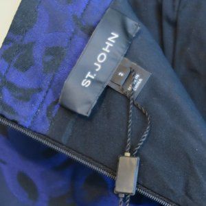 NWT St. John Cobalt/Caviar Evening Satin-Sheen Skirt Size 2 MSRP $695. Waist is 28", hips are 37" and length is 23". There is a 1.5" waistband with belt loops. 60% acetate and 40% polyester fully lined with 68% acetate and 32% polyester. Rear center zipper. Front has pleats and two diagonal pockets. Gorgeous deep cobalt blue and black geometric pattern with a satin-sheen. 5" rear center kickpleat. Perfect for parties, evenings, cruises, cocktails or special occasions. New with tags. MSRP $695