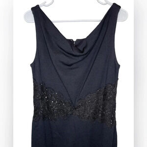 NWT St John Evening Santana Drape Neck Black Lace Middle Dress Dark Blue Size 12
