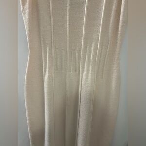 Turn heads in this stunning and sophisticated sleeveless knit dress, perfect for brunch, office chic, or an evening out. The soft cream fabric hugs the body beautifully, while the vertical ribbed detailing elongates the silhouette for a flattering fit.