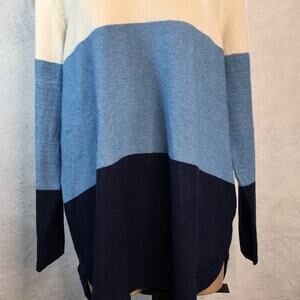 New With Tags St John's Bay Long Sweater with Cowl Neck. Blue & Cream Colorblock. Women's Size 1X. My mannequin is a small so the sweater will not be as long on someone who is a true size 1X.