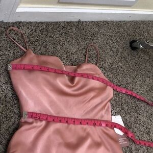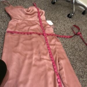 New with tag no flaws. Sleeveless, cowl neck, fit and flare silhouette gown with thigh high slit. Satin shine material with some slight stretch. Zips in back. Custom size. Fits like 4.