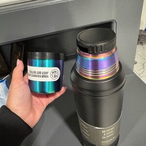 Stanley bottle with a teal base and black body. Sleek and functional design.