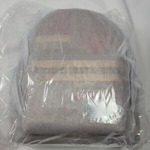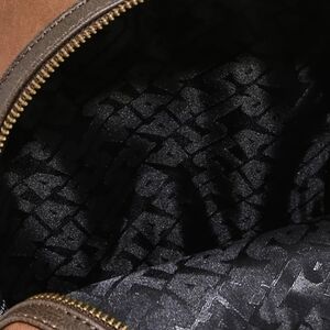 Brass accented front zipper pocket and adjustable brown faux leather straps.