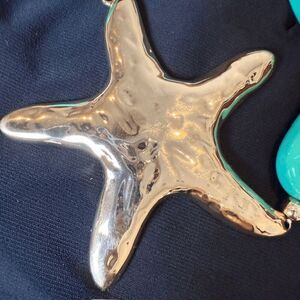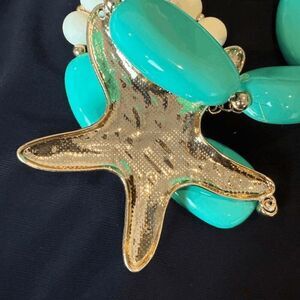 NWT Starfish Lucite and Gold Tone Statement Necklace and Earring Set Turquoise Beads with smaller white beads. Offset Hammered Gold Tone Starfish. chunky necklace, casual jewelry, costume jewelry, boho, bohemian, date night, dinner, vacation, beach, island, seashore, cruise, ocean, starfish, sea turtles, palm trees, statement piece, conversation piece, bold, coral, aquarium, snorkel, Aruba, Caribbean, Cayman, travel, tropical, nautical, fish bone, bonefish,