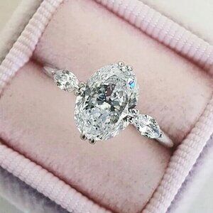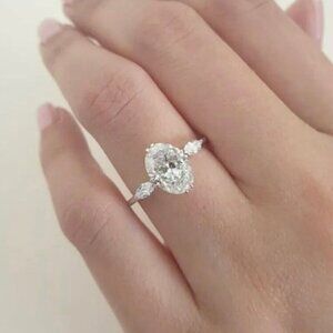 Gorgeous vintage style engagement ring featuring large sparkling oval cut solitaire cubic zirconia in prong setting complimented with two small marquise cut gems on both sides.