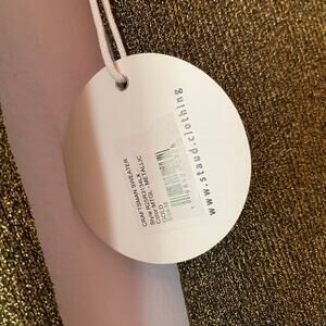 NWT Staud Women's size Medium Craftsman Sweater in a stunning gold metallic finish. This cardigan sweater is perfect for adding a touch of glamour to any outfit, whether it's for a holiday celebration or a night out on the town. The off-the-shoulder design adds a unique and stylish twist to the classic cardigan silhouette.