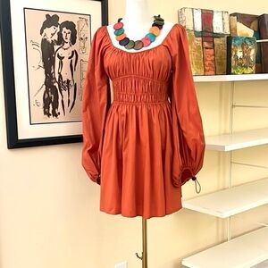 NWT Staud,Form Flattering Bow Dress Puff Sleeve Mini Rust Red, Boho, Lux,Size 6