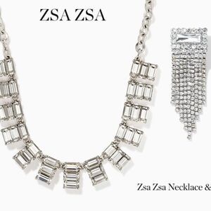 Stella & Dot Zsa Zsa necklace with rectangular cubic zirconia main stone surrounded by 39 white gemstones, set in rhodium-plated brass, new with tags, in original box.