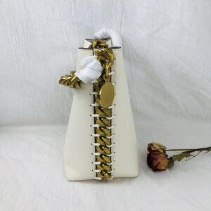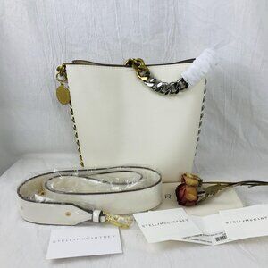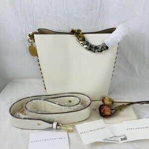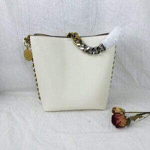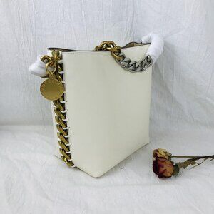 "The Frayme Tote Bag features a bold, plain style, classic brand elements, and a new attitude to reinvigorate it. Inspired by the iconic Falabella, the oversized chain outlines the edges and complements the grain pure material that replaces leather. Shoulder back or hand held to create extraordinary attraction at any time.