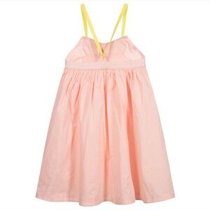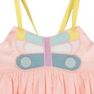 New with tags Stella McCartney Kids dress with yellow shoulder straps. Made and lined in lightweight cotton, Adorable green and white butterfly appliqué on the bodice with pink embroidery.