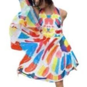 Design: Features a vibrant, multi-color butterfly or watercolor-inspired print on a white background, with an asymmetrical hem and a hidden zipper closure.