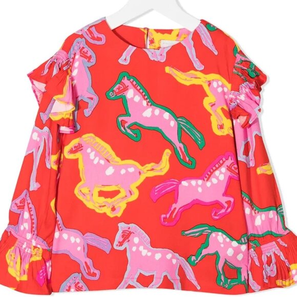 New with tags Stella McCartney Kids long sleeve shirt. Flowy blouse style. Featuring a vibrant horse print in red and pink hues. Relaxed fit, round neckline, button closure on the back, elastic ruffle cuffs on sleeves.