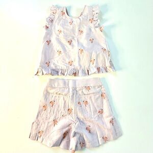 Design: The set includes a sleeveless top with ruffles and matching shorts, both adorned with a flamingo print.