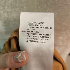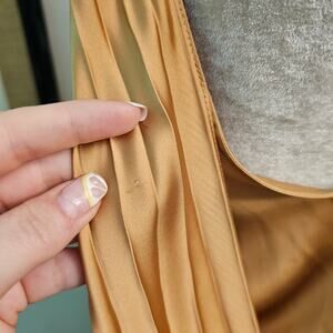Fully pleated top layer in golden satin that has lace-up ties on each side that you can adjust. Dress underneath is a straight slip dress in the same color. Gathered at the neck and straps that tie and are adjustable.