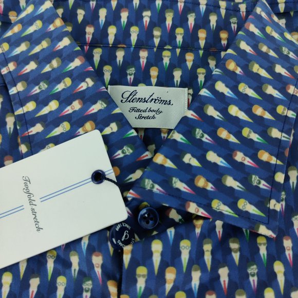 NWT Stenstroms Businessmen Print Fitted Body Stretch Blue Dress Shirt