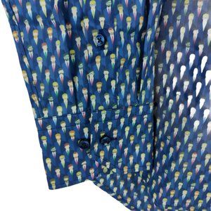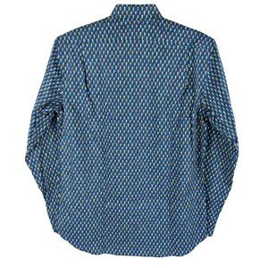 New with tags. This Fitted Body shirt features a playful printed businessmen pattern. Cut for a slightly tailored waist and comfortable fit with added stretch and detailed with navy pearlescent buttons.
