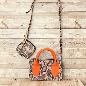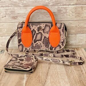 2 Pieces Tan / Brown Snake print with orange Crossbody bag & Airpods case
