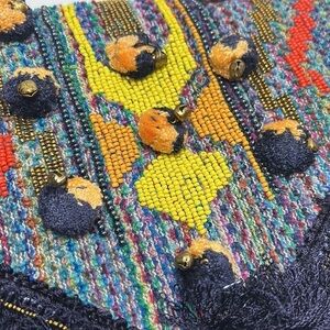 Flap clutch bag crafted in soft colorful "carpet" fabric.Flap trimmed with fringe and features beaded accents and pom pom appliques with tiny bells.Tassel bag charm. Snap closure. Lined with zip pocket.11.75"W x 8.5"H x .2"D